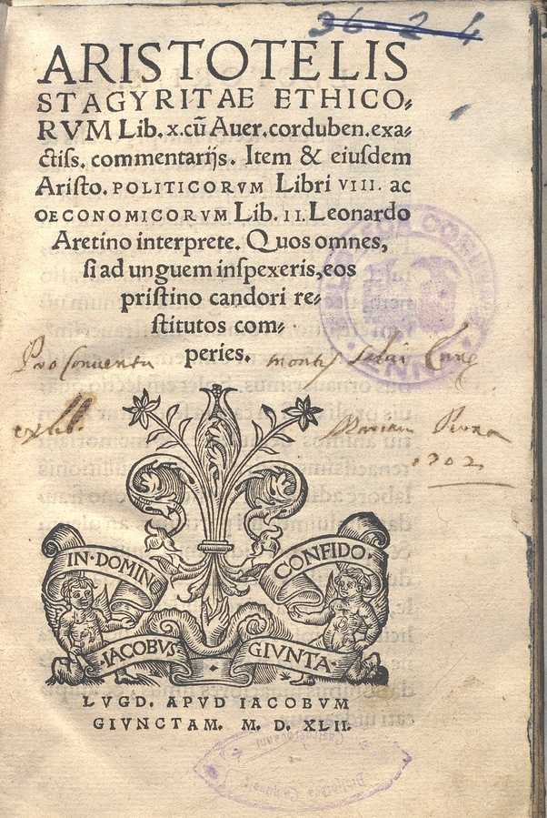 ARISTOTELIS ETHICORUM. LEONARDO BRUNI D’AREZZO. 1542