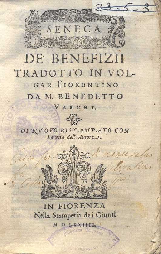 DE BENEFIZI TRADOTTO IN VOLGARE FIORENTINO DA M.BENEDETTO VARCHI. 1574
