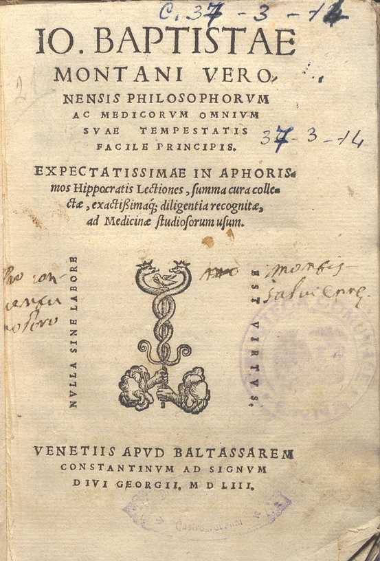 IN APHORISMOS HIPPOCRAT LECTIONES. G.B. MONTANO. 1553-1555