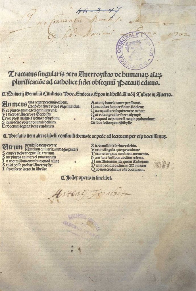 OFFREDUS APOLLINARIS, EXPOSITIO ET QUAESTIONES IN LIBROS ARISTOTELIS DE ANIMA. VENEZIA 1496