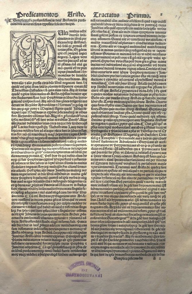 PAULUS VENETUS, EXPOSITIO IN UNIVERSALIA PORPHYRI ET PRAEDICAMENTA ARISTOTELIS.(PRECEDE)JACOBUS DE BONAGUISIS EPISTOLA NICOLETTO VERMIAE.VENEZIA 1494