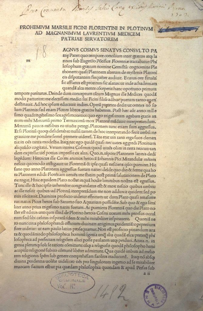 PLOTINUS, OPERA. COMM. MARSILIO FICINO. (PRECEDE) PORPHYRIUS, VITA PLOTINI. CON MARSILIO FICINO, PROHEMIUM AD LAURENTIUM MEDICEM; FIRENZE 1492