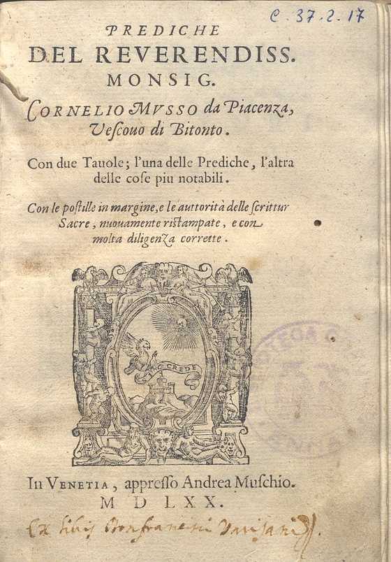 PREDICHE DE REVERENDIIS. MONS. CORNELIO MUSSO DAPIACENZA, VESCOVO DI BITONTO. 1570