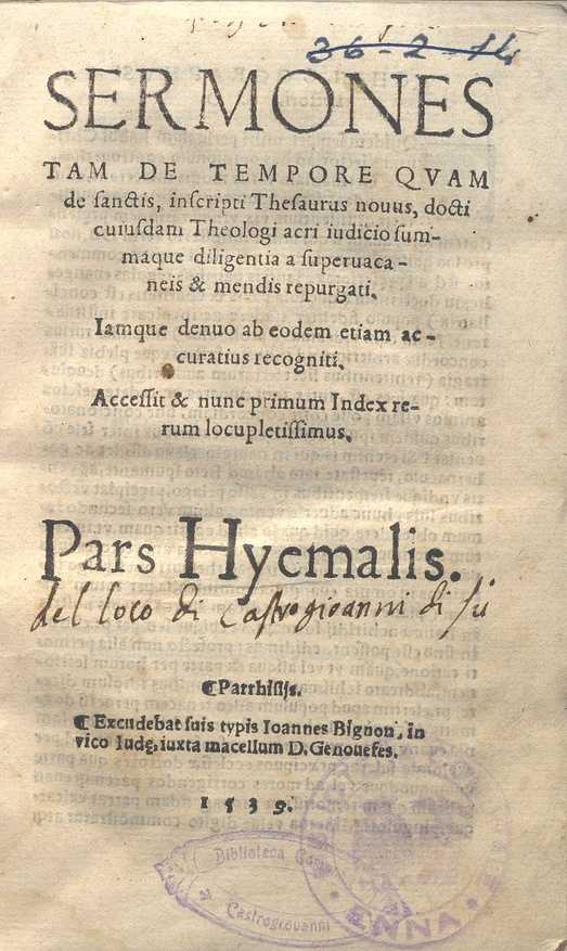 SERMONES TAM DE TEMPORE QUAM DE SANCTIS. OPERA DI UN TEOLOGO DEL 1539