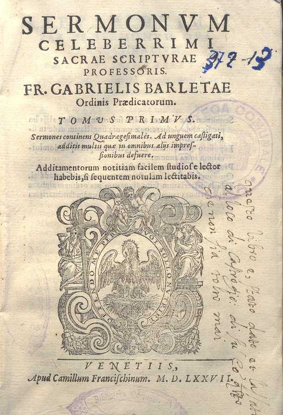 SERMORUM CELEBERRIMI SACRAE SCRIPTURAE PROFESSORIS. FR. GABRIELIS BARLETTAE. 1577