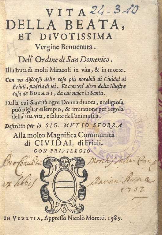VITA DELLA BEATA VERGINE BENVENUTA. M. SFORZA. 1589